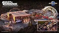 In May 2022, a Fast & Furious–themed roller coaster was revealed to be in development at Universal Studios Hollywood.[1][2] On January 8, 2023, the stage shows Animal Actors on Location and Special Effects Stage closed down to make way for the attraction.[3][4] On July 12, 2023, it was announced that the coaster began construction.[5][4][6] On May 3, 2024, Universal announced that the coaster, revealed as "Fast & Furious: Hollywood Drift", will open in 2026 and will be the park's "first ever high-speed outdoor roller coaster".[7][8] By April 2025, the coaster track was completed.[9]