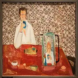 She was also recognized for her mixed-media work, which sometimes uitilized wallpaper remnants or tissue paper. In one painting, two people are having coffee. Only one person is in the painting; the other is reflected in the coffee pot.