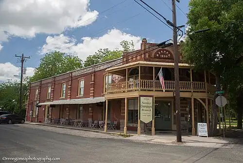 The seven two part commercial block buildings in the district are two stories. Two of them, both fronting the town square featured a store on the first floor and residences for the owner above. They are the Sarrazin Store and Steve's Corner Store. The standard two part block consists of commercial space with a storefront on the first floor and office, storage or residential space upstairs. Most in Fayetteville had canopies or roofs extending over the sidewalk. A good example of the two part block form is the Zapp Building one of the town's few high–style commercial buildings. The red brick building with buff brick accents and a corner entry was built in 1900 to replace an earlier structure lost to fire. It operates as an inn and is listed on the National Register of Historic Places and as a Recorded Texas Historic Landmark.[2][4]
