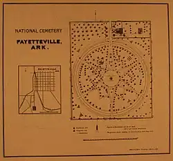 The original plot of 6 acres (2.4 ha) of land for the National Cemetery was purchased in 1867 from Judge David Walker and Stephen Stone,[3] names also associated with the historic Walker-Stone House in Fayetteville. The original layout was of an outer circle surrounding a six-pointed star with diamonds between the points of the star and a flagpole in the center. There were eighteen sections with an estimated capacity of 1,800 graves.[4] The first interments were remains moved from battlefield cemeteries of the Battle of Prairie Grove and the Battle of Pea Ridge. By 1871 there were 1,200 interments made in the cemetery, most of which were unidentified.