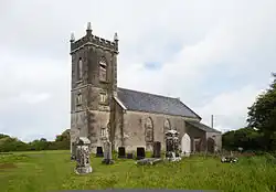 Feigh West is located on a hillock at the site of a ruined medieval church of rectangular shape, 19m × 7.5m. The church is surrounded by a grave yard with headstones dated from the 18th to 20th century.[2] East of the ruins is a disused church of the Church of Ireland, erected in 1813 with funds of the Board of First Fruits.[3] South-east of the Protestant church is a former two-storey glebe house, built in 1816 and also financed with the assistance of the Board of the First Fruits. It is now used as a private home.[4]