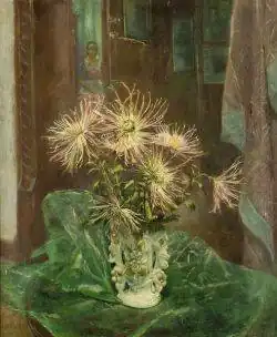 Over the course of her career Meyer came to be known best for her landscapes of the Vermont locale where she spent the summer months.[12] Her 1940 painting, "Vermont Hillside," (shown at left) is typical of these landscapes. She was also known for depictions of the New York locale where she spent the cooler months. Her painting, "Cocktails on the Terrace" (shown at right) is typical of these.[9] She was also known for her floral still lifes, such as the one shown at left[12] and figure studies, such as the self portrait shown at right.[19]