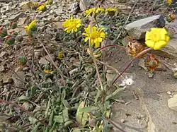 The firm and large flower heads sit individually on top of an almost leafless, hairy stalk of up to 10 cm (4 in) long. The involucre is about 1 cm (2⁄5 in) across, and consisting of two strict rows of equally long bracts. Those in the outer row are about 1 mm (0.04 in) wide, lance-shaped, roughly and glandular hairy with a fringe of hairs near the tip. Those in the inner row narrowly obovate, 11⁄2 mm wide, with a broad papery margin and eventually hairless. Many female ray florets with a light blue, rarely yellow, strap, are 2 cm (4⁄5 in) long and 21⁄2 mm (0.1 in) wide, with a hairy tube. Many bisexual, softly hairy disc florets with a yellow corolla of about 5 mm (1⁄5 in) long. In the center of each corolla are five anthers merged into a tube, through which the style grows when the floret opens, hoovering up the pollen on its shaft. At the tip of both style branches is a narrowly triangular appendage. Around the base of the corolla are many white pappus bristles with teeth, that are easily discarded. The dry, one-seeded, indehiscent fruits called cypselae are large, 3 mm (0.12 in) long and 11⁄2 mm (0.6 in) wide, inverted egg-shaped, yellowish brown to brown, with a strong marginal ridge, with thick, 1⁄2-1 mm (0.02–0.04 in) with short, robust hairs.[2][4]