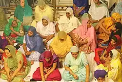 According to Sikh tradition, both men and women are to follow the five Ks: Kesh (uncut hair), Kangha (comb), Kara (iron bracelet), Kachera (cotton undergarment) and Kirpan (iron dagger). Both men and women are to be treated equally inside a Gurudwara, and required to follow the same etiquette: both men and women should cover their head and wear modest clothing, both sit side by side in congregation and to eat langar. Although Sikh scriptures are usually publicly recited by men, there are no restrictions on who can become a granthi, and women can also apply. Both men and women can choose to wear a turban. Sikh women usually take the surname Kaur, with the purpose of rejecting both casteism and inequality among men and women. Similarly, Sikh men usually take the surname Singh. The Sikh faith condemns the practices of female infanticide,[57] widow burning,[58] dowry,[59] and treatment of menstruating women as impure,[60] and also discourages seclusion and face veil.[61] However, many of these are still practiced by Sikhs.
