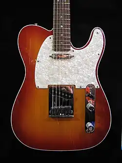 The entire range came with options such as solid tonewood bodies made from alder or ash, chrome or gold-plated hardware, aged plastic parts, Noiseless pickups, abalone shell dot position fingerboard inlays, a dark aluminum "spaghetti" decal,[3] 22-fret maple necks featuring rosewood, maple or ebony fretboards, quilted or flamed maple tops, rolled fingerboard edges, Fender S-1 switching,[4] highly detailed nut and fret work, a bound top with contoured back on Telecasters, a two-point synchronized tremolo with pop-in arm,[5] LSR roller nut[6] on the HSS model Stratocaster, and staggered locking tuning machines[7] on certain models.