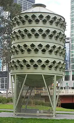 When eggs are removed in artificial pigeon houses, the interval between reproductive attempts is strongly reduced, which reduces the efficiency of the method.[90] Dummy egg nesting programs have therefore been tested in some cities with mixed results. There, the eggs are removed and replaced with dummy eggs. The real eggs are then destroyed. One such structure, in Batman Park in Melbourne, Australia, was unsuccessful in attracting pigeons and has since been removed.[91][92] The loft used in Melbourne was on stilts, with a cage door allowing access from beneath for accessing the structure at night when the pigeons are asleep.