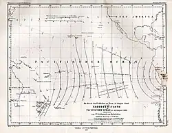 His analysis[8] of the tsunami generated by the 1868 Arica (Peru) earthquake is well known for its contribution to understanding of tsunami propagation.[9] The resulting tsunami caused damaging surges in a number of regions in the Pacific region, including fatalities on the Chatham Islands. Von Hochstetter, charted the trajectory of the event throughout the Pacific. This also enabled an estimate of the depth of the Pacific Ocean to be calculated.