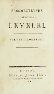 His emotional world was refined by the saloon life of Kassa, whose social pleasures he felt as delightful as the Freemasonry ceremonies which he often attended. His desires were tense between Teréz Radvánszky and Zsuzsanna Kácsándy. For the "nice companies" gathered in the saloons of the Török, Kácsándy and Bárcsay families and for female members of the Freemasonry he addressed his Bácsmegyeynek öszve-szedett levelei (English: Collected letters of Bácsmegyey) in 1789. It was a translation of Albrecht Christoph Kayser's Adolfs gesammelte Briefe which was a pastiche of Werther.[7] This form of translation, which differs from the principle of faithful translation followed during his works on the Gessner Idylliumi, was common in Hungarian literature at that time, but not in such a way as Kazinczy did in his Bácsmegyeynek öszve-szedett levelei. He moved the figure and scene of Kayser's original novel into the role of his friends and into the scenes of their frequent gatherings which showed a rare example of personal self-expression in translation. In some cases his protagonist openly attacks the estates of the realm as a limitation of freedom for humans and emotions. The first edition was indeed a great success in Hungarian public life. Ádám Pálóczi Horváth, János Földi, Mihály Csokonai Vitéz, Sándor Kisfaludy, Mihailo Vitković and Benedek Virág enthusiastically welcomed it.[7] However Kazinczy also received criticism from conservative writers and from his teachers in Sárospatak.[14]