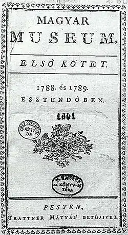 - ^ "A KASSAI MAGYAR MUSEUM, AZ ELSŐ ÖNÁLLÓ MAGYAR NYELVŰ FOLYÓIRAT (1788–1793) - A magyar sajtó története - Kézikönyvtár". www.arcanum.hu.