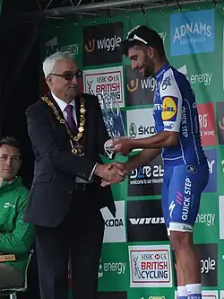 Gaviria made his debut for Etixx–Quick-Step as a stagiaire in August 2015 at the RideLondon–Surrey Classic.[24] He finished in eighth position, the highest-placed Etixx–Quick-Step rider.[25] His next race for the team was in the Czech Cycling Tour, where Etixx–Quick-Step won the first stage, a team time trial.[26] The following day Gaviria won his first individual stage victory for the team, winning a reduced bunch sprint.[27] After this race, it was the Tour of Britain, where Gaviria managed to take one stage win ahead of several world class sprinters including André Greipel and Elia Viviani.