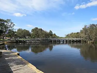 ![]() Kent Street Weir, Canning River Regional Park, viewed from the Wilson side of Canning River and with Ferndale on the right of the image. | |||||||||||||||