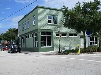 The Feroe Building, also known as the Harry C. Feroe Building, is an historic two-story commercial building located at 73 S.W. Flagler Avenue, corner of S.W. St. Lucie Avenue in Stuart, Martin County, Florida. To its north of along Flagler Avenue is Fellowship Hall built in 1912 as the Bank of Stuart, while to the east along Flagler Avenue is the Lyric Theatre built in 1925 and later expanded. Built and named for Harry C. Feroe, who was associated with Charles C. Chillingworth in the development of Palm City, it was built in 1913 by local contractor Sam Matthews using locally manufactured concrete blocks which had been cast by Frank Frazier to look like stones. The ground floor, which fronted on St. Lucie Avenue and featured cast-iron columns, was designed for retail use, while the second floor, which was accessed by stairs from an entrance on the Flagler Avenue side of the building, was designed for office space. Later in 1913 the Florida East Coast Railway built its now demolished Stuart Depot directly across Flagler Avenue from the building, which enhanced its value. Early ground floor tenants were the Stuart post office in the corner space and the Stuart Drug Company to its north. After the post office moved out, its space was occupied by various other businesses until eventually being combined with the drug store space. Marilyn's Pharmacy, a Rexall agency, occupied the space in the 1960s and early 1970s. In the middle 1980s local lawyer Larry M. Stewart bought the building and renovated it for his law offices. The main entrance was moved to the east side of the building with access from a courtyard which is entered from Flagler Avenue through an arched wrought-iron gate. In 2020, the building was purchased and occupied by one of the premier law firms in Stuart, Kibbey Wagner, PLLC. They renovated and updated the building’s exterior and interior. [1][2] [3] [4]