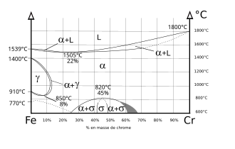 The iron-chromium phase diagram shows that up to about 13% Cr, the steel undergoes successive transformations upon cooling from the liquid phase from ferritic α phase to austenitic γ phase and back to α. When some carbon is present, and if cooling occurs quickly, some of the austenite will transform into martensite. Tempering or annealing will transform the martensitic structure into ferrite and carbides.