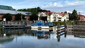 Ferry Lina (Färjan Lina) is the world's shortest regular ferry. It crosses the Göta Canal, in Sweden, taking about 25–30 seconds to do so. The ferry is powered by pulling a rope that must be lowered when a boat is passing.[1][2] It appears in the Swedish comedy movie Göta kanal 3.