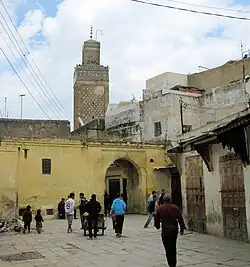 Both the exact reasons and the exact date for the creation of the Jewish Mellah of Fes are debated by scholars. Broader political motivations for moving the Jewish community to Fes el-Jdid, closer to the royal palace, may have included the Marinid rulers' desire to take more direct advantage (or control) of their merchant and artisan skills and of their commercial relations with Jewish communities in other countries (which could act as an avenue for foreign relations).[10][11] Historical accounts confirm that in the mid-14th century the Jews of Fes were still living in Fes el-Bali but that by the end of the 16th century they were well-established in the Mellah of Fes el-Jdid.[4] Some authors argue that the transfer likely happened in stages across the Marinid period, particularly following episodes of violence or repression against Jews in the old city.[11] The urban fabric of the Mellah appears to have developed progressively and it's possible that a small Jewish population settled here right after the foundation of Fes el-Jdid and that other Jews fleeing the Fes el-Bali joined them later.[14] Some authors attribute the move more specifically to a consequence of the "rediscovery" of Idris II's body in his zawiya at the center of the city in 1437.[14] Following this, the area around the mosque was turned into a horm (sanctuary) where non-Muslims were not allowed to enter, resulting in the expulsion of the Jewish inhabitants from the city's commercial center.[11][14] Many scholars therefore estimate that the move took place in the mid-15th century.[10][15] The Mellah's Jewish cemetery was established at its western edge (the current site of Place des Alaouites) on land which was donated to the Jewish community by a Marinid princess named Lalla Mina in the 15th century.[6][10]