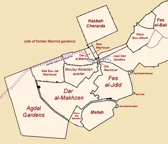 The Marinid city was protected on all sides by two lines of walls, which on the east and west ran together but to the north and south were separated from each by intervening gardens or districts.[6] What is now called the Old Mechouar (Vieux Méchouar), a large walled square fronting the entrance to the Royal Palace, was originally a fortified bridge over the Fes River set between two gates defending the northern entrance to the city. (Unlike today, the gate on the south side of this bridge/square led to the main city rather than directly to the palace, whose grounds did not yet extend to this point.[6]) The northern gate of this bridge was known as Bab es-Sebaa (now called Bab Dekkakin), while the southern gate was known as the Bab al-Qantara ("Gate of the Bridge") or Bab al-Oued ("Gate of the River").[4]: 62  The relative importance of this northern entrance was likely due to the presence of the road to Meknes (the closest major city).[6] From Bab al-Qantara the city's main street (now known as the Grande Rue de Fes el Jdid) ran directly to the southern gate, Bab 'Oyun Sanhaja (now called Bab Semmarine).[6]