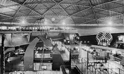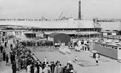 There were other displays elsewhere, each intended to be complete in itself, yet each part of the one single conception.[8] Festival Pleasure Gardens were set up in Battersea, about three miles up river from the South Bank. Heavy engineering was the subject of an Exhibition of Industrial Power in Glasgow. Certain aspects of science, which did not fall within the terms of reference of the South Bank Exhibition, were displayed in South Kensington. Linen technology and science in agriculture were exhibited in "Farm and Factory" in Belfast. A smaller exhibition of the South Bank story was put on in the Festival ship Campania,[3] which toured the coast of Britain throughout the summer of 1951, and on land there was a travelling exhibition of industrial design.[8]