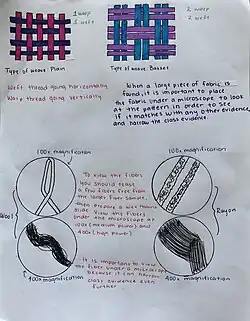Fiber analysis is a method of identifying and examining fibers used by law enforcement agencies around the world to procure evidence during an investigation. Fiber analysis is also used by law enforcement agencies to place suspects at the scene of the crime. Transfer of fiber can occur during close contact with the victim or suspect. Fiber transfers can also occur during break-ins where fibers from the intruder are caught in.[1][2] Fiber evidence is a type of trace evidence, this means it will likely be very small and sometimes could be microscopic.[3] This method is usually not used to actually pinpoint an offender in an investigation as it is not as reliable as DNA.[1]
