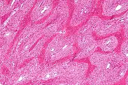 Fibrous dysplasia is a very rare[2] nonhereditary genetic disorder where normal bone and marrow is replaced with fibrous tissue, resulting in formation of bone that is weak and prone to expansion. As a result, most complications result from fracture, deformity, functional impairment, pain, and the impingement of nerves.[3] Disease occurs along a broad clinical spectrum ranging from mostly asymptomatic incidental lesions, to severe disabling disease. Disease can affect one bone (monostotic), multiple (polyostotic), or all bones (panostotic)[4][5] and may occur in isolation or in combination with café au lait skin macules and hyperfunctioning endocrinopathies, termed McCune–Albright syndrome.[3] More rarely, fibrous dysplasia may be associated with intramuscular myxomas, termed Mazabraud's syndrome.[6] Fibrous dysplasia is very rare, and there is no known cure.[2] While fibrous dysplasia is not itself a form of cancer, in severe cases it may undergo a malignant transformation into cancers such as osteosarcoma or chondrosarcoma, so some clinicians may regard it as precancerous rather than benign.