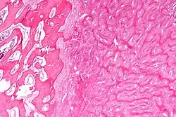 Micrograph of fibrous dysplasia (right) juxtaposed with unaffected bone (left). H&E stain.