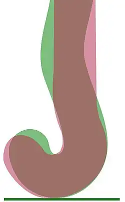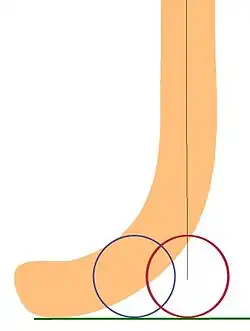 The extent of the stick head along the X+ axis, towards the 'heel' of the Head is confined by the rule requirement that the stick head and the handle meet in a smooth continuous fashion at the line C-C and by a rule restriction on the shape of the handle, which is that the stick-handle must not project beyond the line B1-B1. It is possible to envisage a stick where the width of handle did not extend beyond the line A1-A1, thus allowing a significant extension of the stick head along the X+ axis, but the practicalities of such a design seem to be limited and have not been explored. The length of the Head (or toe) along the X- axis has varied enormously, especially since the Second World War and again after the introduction of the timber lamination process in the early 1980s.