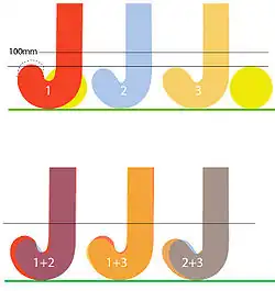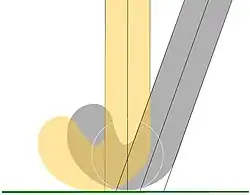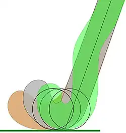 A hockey stick is occasionally used in the vertical position shown, but manipulating the movement and the direction of the ball in a controlled way (dribbling) is carried out in what is termed a "dribbling crouch", when the handle of the stick will usually be angled between 35° and 55°. Hitting or pushing the ball can be done with the stick at any angle between the vertical and horizontal and recent changes to the rules allow even the edges of the stick to be used to sweep or strike at the ball on the ground. The various stick head designs can be compared in respect of how, with the handle at an angle of 45°, they differ in the carrying out of the Indian dribble, i.e. controlling the direction of the ball by rotating the stick head over the top/front of the ball rather than (or as well as) around the back of the ball (the English style dribble). The multi-layered stick head diagram indicates the changes in head shape and length that occurred over thirty years or so.