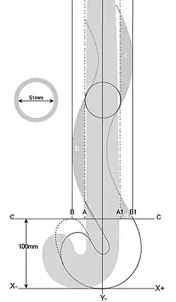 To describe the dimensions of head and handle the hockey stick is envisaged to be placed with the bottom curve of the stick head on a level surface, the x-axis, with the stick-handle perpendicular to it (the y-axis). The y-axis runs from an intersection with the x-axis (0) vertically through the midpoint of the top of the handle. The Head is the part from the x-axis to the line C-C (diagram) a vertical distance of 100 mm. This line C-C also describes the limit on any upturn to the toe of the head. By Rule there is no limit to the length of the stick head along the x-axis, but practical considerations, as well as technicalities related to the joining of the head and the Handle (on the line C-C), did create limitations with wooden sticks.