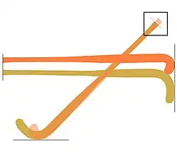 Using extreme examples is useful as a means of demonstrating effects that occur in less extreme configurations but are much more difficult to spot and therefore to explain. The first observation is an easy one (top left in the image captioned "Reversed head in various…"). If the stick head is rotated onto the reverse (lighter colour) the toe is not going to disappear into the ground to enable the reverse side of the stick to be presented to the ball—a vertical adjustment is necessary. Secondly (top right), if the handle of the stick is kept at exactly the same angle and rotated, a horizontal adjustment is necessary to bring the reversed head to a position where contact will be made with the ball. The third figure (bottom left) shows these adjustments having been made (and a change to the angle of the handle because the position of the hand holding the stick at the top would be about the same as it is when gripping the stick in the forehand position), but the area of stick head making contact with the ball is very small; so control may not be adequate. The fourth figure (bottom right) demonstrates that to get good contact with the ball on a larger area of the reversed head, it is necessary to move the handle much nearer to the vertical. This means the player must bring the ball in very close to the feet and come to a more upright dribbling position—this in turn impairs the ability to scan the pitch and keep the ball in peripheral vision at the same time—a considerable disadvantage when dribbling to evade opponents.