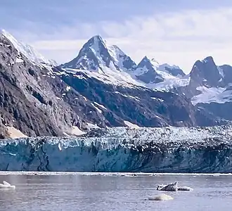 Fifty Years of Alaskan Statehood is located in the Fairweather Range of the Saint Elias Mountains.[1] It is set within Glacier Bay National Park and Preserve and is situated six miles (9.7 km) northwest of Mount Bertha. Precipitation runoff from the mountain drains to Johns Hopkins Inlet where cruise ships allow views of the peak and the Johns Hopkins Glacier. Although modest in elevation, topographic relief is significant as the summit rises up from tidewater in seven miles (11 km) and the north face rises 6,100 feet (1,860 m) in 1.5 mi (2.4 km). The first ascent of the summit was made on May 2, 2009, by Paul Knott and Guy McKinnon, who also named this peak.[2] The mountain's toponym has not been officially adopted by the U.S. Board on Geographic Names, and it will remain unofficial as long as the USGS policy of not adopting new toponyms in designated wilderness areas remains in effect.