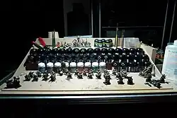 As the casting process was refined and newer plastics were introduced the details that could be cast in plastic improved.[9] Plastic models started to become much more common, being produced to high levels of details and sold as equivalent quality or superior quality premium product compared to metal. Many companies now produce all or the majority of their models in high quality plastics, often polystyrene.[10] With the increase in production of plastic models the models produced could be made increasingly larger and with more details. Whilst hand sculpting a master to then cast a mold is still a common practice, it is becoming increasingly common for models to be digitally sculpted and a master 3D printed to then cast the molds from.[11] This has greatly increased the quality of details that can be sculpted, as finer details can be included. For these higher levels of detail, plastic models have become more popular for higher standards of painting, as well as plastic models being less susceptible to flashing or casting imperfections and requiring less preparations before painting.[12] Plastic models also allow for more options in the pose of the models as they are often sold on the sprue in pieces to be assembled, rather than a single piece of cast material. This allows for the kit to include multiple parts, as plastic is significantly cheaper than metal, that can fit together to allow multiple different variations of the model to be built, for example a kit might provide multiple different weapon options.