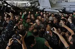 Filipino sailors of the US Navy met by Philippine President Benigno Aquino III in the hangar bay aboard the USS Carl Vinson (CVN-70) on 14 May 2011.