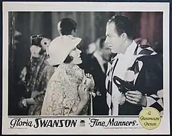 Fine Manners is a 1926 American black-and-white silent comedy film directed initially by Lewis Milestone[1] and completed by Richard Rosson for Famous Players–Lasky/Paramount Pictures. After an argument with actress Gloria Swanson, director Milestone walked off the project, causing the film to be completed by Rosson,[2] who had picked up directorial tricks while working as an assistant director to Allan Dwan.[3] The success of the film, being Rosson's first directorial effort since he co-directed Her Father's Keeper in 1917 with his brother Arthur Rosson,[4] won him a long-term contract with Famous Players–Lasky.[4]