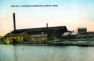 In 1903, Finkbine Lumber Company completed construction of a new double-band sawmill at Wiggins. The new mill was able to produce 125,000 board feet of lumber per day. It had five dry kilns, a large planing mill and a shed for storing finished lumber. The mill sawed longleaf pine logs into dimensional lumber and construction timbers. Finkbine Lumber Company conducted business in both domestic and export markets. The shipping port in Gulfport, Mississippi served as their export hub.[6]