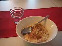The Finnish breakfast traditionally includes a substantial portion of porridge. Rolled oats, rye or multi-grain porridge are most common. However, there are other options such as the milk-based mannapuuro (semolina-milk porridge) and helmipuuro (starch grain-milk porridge). Porridges are often eaten with milk, sugar, butter or berry kiisseli. The Christmas season introduces milk-based rice porridge (riisipuuro), sprinkled with cinnamon and sugar and often topped with prune kiisseli (luumukiisseli). There is also a semolina-based porridge flavored with fresh or frozen lingonberries called vispipuuro ("beaten porridge").