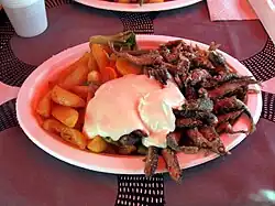 The most popular meats in Finland are pork (33.5 kg/year/person in 2005), beef (18.6 kg), and chicken (13.3 kg).[6] Approximately one third of this is eaten as sausage (makkara), which is mostly made from pork but often mixes in other meats as well.[7] Horse meat, lamb and reindeer make up a small portion of the total meat consumption, but they are widely available.[8]