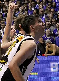 He had a strong 2017-2018 season,[17] helping Haukar to the best record in the Úrvalsdeild and first seed in the playoffs.[18] The season however ended on a disappointing node with Haukar being knocked out of the playoffs in the semi-finals by KR.[19] Finnur left Haukar after the season and signed as a strength coach with Hungarian club Ceglédi EKK.[20][21] He left the club in November that year and returned to Iceland.[22] After playing one game for KR-b in the 2. deild karla on 11 November, he was called up to the main KR squad.[23] On 2 May 2019, Finnur scored 15 points in 14 minutes in KR's game four victory against ÍR in the Úrvalsdeild finals.[24]