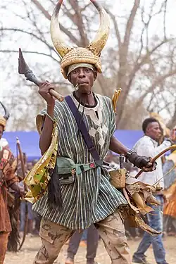 War dancers from different villages in the region perform on stage. They are armed with bows and arrows, short axes, shields and spears to relive scenes from wars from the previous years. There are also scenes of resistance and how Babatu was defeated.[4]