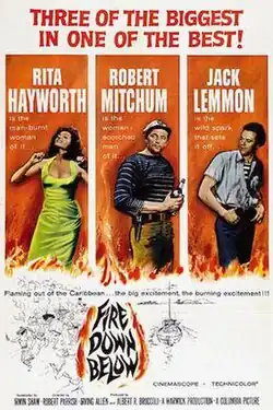 Fire Down Below is a 1957 adventure drama film with a screenplay written by novelist Irwin Shaw, starring Rita Hayworth, Robert Mitchum and Jack Lemmon, and directed by Robert Parrish. Based on Max Catto's 1954 novel with the same title, the picture was made by Warwick Films on location in Trinidad and Tobago, in Technicolor and CinemaScope, and released by Columbia Pictures.