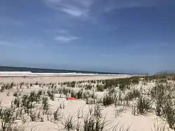 The island was heavily damaged by the high tides associated with Hurricane Sandy in 2012, including three breaches around Smith Point County Park on the sparsely populated eastern end of the island. The biggest breach, and politically the most difficult one to deal with because it is in a wilderness area, is at Old Inlet in the Otis Pike Wilderness Area just west of Smith Point County Park. Old Inlet is at the site of previous breaches (which have come and gone on their own) and was 108 feet (33 meters) wide after the storm on the south end and 1,171 feet (357 meters) on February 28, 2013.[42] Officials have been debating whether to close the breach and let nature take its course, as it has been flushing out the Great South Bay and improving water quality. But residents of the bayfront communities noted increased flooding after the storm. This was later found to be the result of several nor'easters and unrelated to the breaches.[43] As of 2018, the breach remained open.[44] Officials have moved to close the other two breaches, which are on either side of Moriches Inlet—one in Cupsogue County Park and the other in Smith Point County Park.[45][46][47]