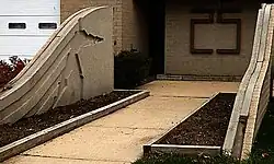 The sculpture includes two primary elements: a pair of neon-topped tapering concrete walls flanking the entry sidewalk, and a wall-mounted neon sign displaying the number 25 in a stylized font. During the day, the neon is not lit. At night, the entry numbers glow red, and the tops of the tapering wall glow blue. According to the Smithsonian Institution's Save Outdoor Sculpture! survey, the red neon symbolizes fire and the blue neon symbolizes water spray from fire hoses.[1]