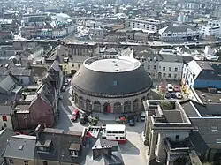 The Firkin Crane building is located near the Church of St Anne, Shandon close to the Cork Butter Museum and the site of the original Cork City Butter Exchange.[6] The building was opened in August 1855, designed to a rotunda plan by Sir John Benson[7] for the Butter Exchange. The building's name derives from the "Firkin" unit (9 gallons or 80Ibs of butter) and the "Crane" weighing scale.[8][9] Where the building currently stands is reputed to have been a possible site for a fort belonging to the MacCarthy Clan.[10][11] The Shandon Butter Factory was housed within the Firkin Crane and the firkins were weighed up there.[12] A margarine factory (James Daly & Sons) replaced the market in 1924. This closed in 1976.