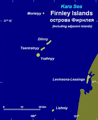 The Firnley Islands (Russian: острова Фирнлея; Ostrova Firnleya, Nynorsk: Firnleyøyane) is a group of three small islands covered with tundra vegetation and with scattered stones on their shores. They lie in the Kara Sea, close to the bleak coast of Siberia's Taymyr Peninsula, not far east of the Nordenskjold Archipelago. These islands lie about 35 km from the continental shore.