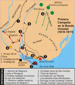 The first Banda Oriental campaign was a military campaign of the Argentine War of Independence, that attempted to capture the Banda Oriental (present-day Uruguay). It took place in 1810–1811. The countryside, led by José Gervasio Artigas, joined forces with Buenos Aires against Montevideo. The viceroy Javier de Elío requested help from colonial Brazil, forcing Buenos Aires to sign a controversial armistice.
