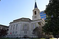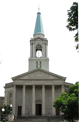 The third (and present) building was completed in 1923 at the Main Street location, three years after Dr. Frederick Fernando Brown became pastor. A four-manual Hook & Hastings organ was installed, featuring an echo organ located in the tower played from a separate keyboard.[3] This architecturally-significant structure, noteworthy for its Neoclassical design and octagonal sanctuary, was designed by Dougherty & Gardner of Nashville, Tennessee, and is modeled on St Martin-in-the-Fields of London. The exterior of the church sanctuary is sheathed in marble, although the adjoining education space is brick.[2] The congregation is moderate,[4] and is member of the Cooperative Baptist Fellowship,[5] a mainline denomination in the South.