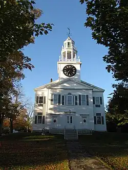 The church is set just south of Belfast's central business district, on a large parcel of land bounded on the northeast by Church Street, the southwest by Court Street, and the southeast by Spring Street. It is set facing Church Street, but well back on the lot, with a grassy lawn dotted with trees in front. The building is a two-story gable-roofed wood-frame structure, built largely to a plan published by Asher Benjamin in The Country Builder's Assistant in 1798. Its front facade has a central projecting section with a gabled top, in which three entrance doors are set. The outer two are identical, with flanking pilasters and entablature above, while the central one is a taller double-leaf door with a similar surround. A tower rises astride the main facade and gable, beginning with a square section housing large clock faces. Above this is an open octagonal belfry housing a Revere bell, with Doric columns supporting the next octagonal stage, which supports the cupola and finial. The lower two stages have low balustrades framing their tops, with urn-topped posts at the corners.[2]