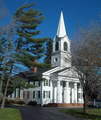 The First Church of Evans Complex is a historic Presbyterian church complex located at Derby in Erie County, New York. The 5.5-acre (2.2 ha) property includes the church, cemeteries, farmhouse (manse), and historic Ingersoll barn with later additions that serves as a community clubhouse. The church is an eclectic Colonial Revival style structure designed by Buffalo architects Mann and Cook and constructed in 1915. The original cemetery includes graves that predate the congregation's founding in 1818.[2]
