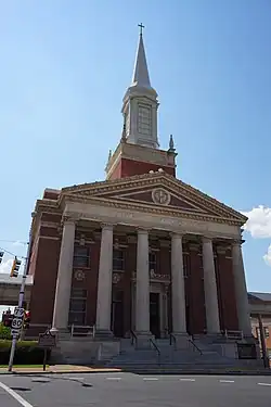 First Methodist Church is a neoclassical edifice, erected in 1913.[6][7][8] It is a brick structure, with a front façade containing a portico with six stone columns. Engraved above the columns are the words "First Methodist Church, South" - at the time of its construction, the church was a member of the Methodist Episcopal Church, South.[7] The main building is flanked by two side buildings completed in 1964, which are connected to the sanctuary by colonnades.[5] In 1972, the neoclassical steeple was added to the building.[8] The steeple was destroyed in 2009 in a storm and replaced in 2012.[9]