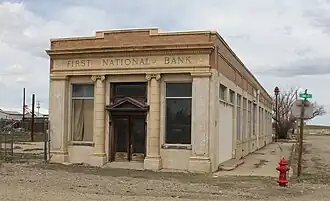 The First National Bank of Rock River was built in 1919 in the small community of Rock River, Wyoming, at the peak of a local oil boom and operated from February 1920. The bank closed its doors on April 11, 1923 (The Wyoming State Journal (Lander), Volume 40, Number 16, April 20, 1923) as the oil boom collapsed and its vice president was convicted of embezzlement. The bank went into receivership on June 14, 1923 and its building sold to the new Citizen's State Bank, but was claimed by Albany County for back taxes in 1931. In 1936 the county sold the building to the town. It became a civic center for the town, operating a post office until the 1950s. A doctor's office had occupied the rear in the 1920s, and in the 1940s apartments were built, which later became the town's jail. With the departure of the post office the building became a fire station. From 1935 to 1985 the Council Room was used by civic organizations. From 1940 to 1985 another room was the town library.[2]