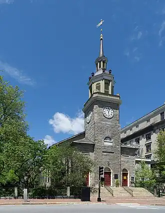 The First Parish Church stands on the north side of Congress Street, opposite its intersection with Temple Street (formerly Meetinghouse Lane),[2] in the civic heart of Portland, with Portland City Hall a short way to the east, the public library a short way west, and Portland High School immediately to its north. The church is a tall single-story structure, built out of granite from Freeport. The granite is ashlar, except for finely dressed corner quoining. The building is basically rectangular, with a projecting three-bay entrance vestibule, from which a square tower projects slightly further. The three entrances are set in round-arch openings with a fanlight above. The multistage tower has an arched louver above a marble date panel at the second stage, and a clock at the third stage, which is differentiated from the second by rounded corners. The belfry is octagonal, with round-arch louvered openings, and is topped by a smaller octagonal cupola and a short spire.[3]