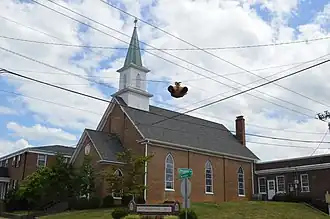 The First Presbyterian Church was founded in 1803. Its 1853 brick building, at the original site for the church, is the oldest church building in Glasgow, and one of few Gothic Revival-style structures. It has pilasters, Gothic arches, a wood bell tower, and common bond brickwork.[2]